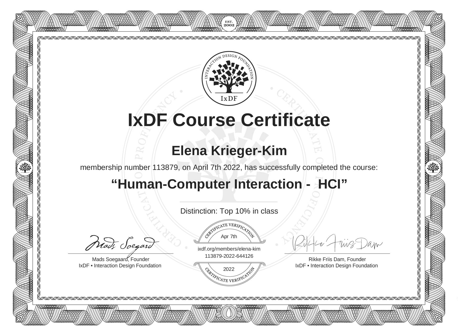 This IxDF Membership Certificate is issued to Elena Krieger-Kim