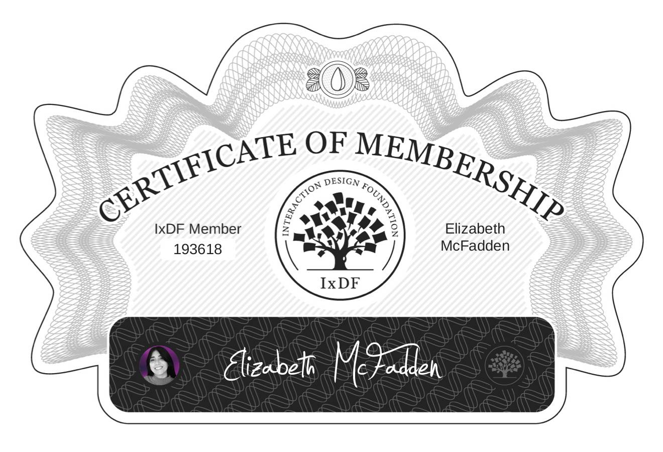 This IxDF Membership Certificate (ID #mc_W9f7Vr6JZ) is issued to Elizabeth McFadden