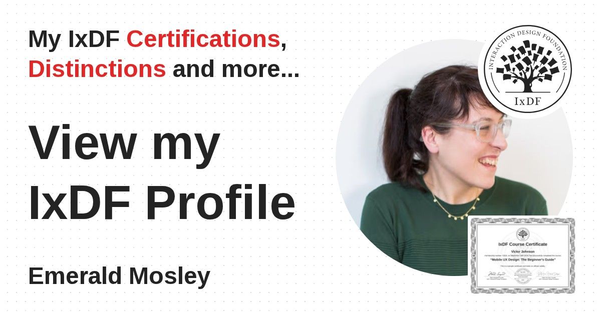 IxDF Course Certificates are awarded to Emerald Mosley in formal recognition of their coursework surpassing the rigorous benchmarks of exceptional performance established by the IxDF Educational Codex.