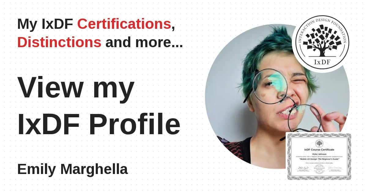 IxDF Course Certificates are awarded to Emily Marghella in formal recognition of their coursework surpassing the rigorous benchmarks of exceptional performance established by the IxDF Educational Codex.