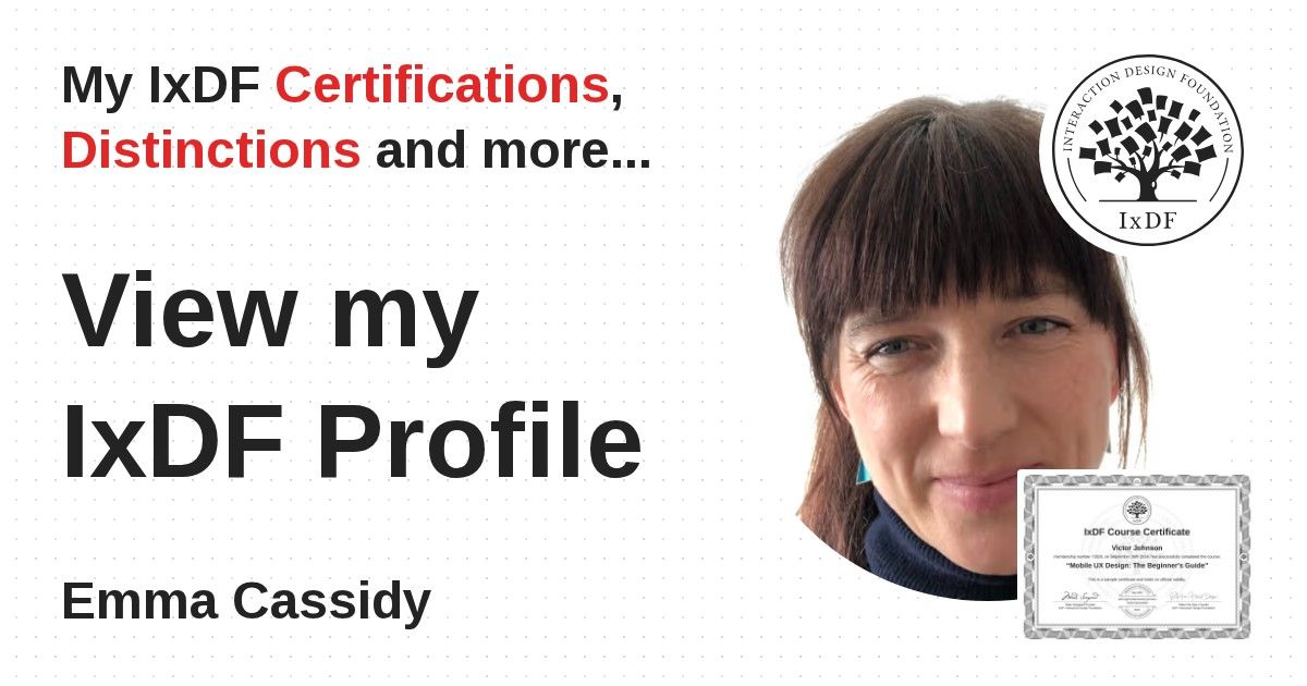 IxDF Course Certificates are awarded to Emma Cassidy in formal recognition of their coursework surpassing the rigorous benchmarks of exceptional performance established by the IxDF Educational Codex.
