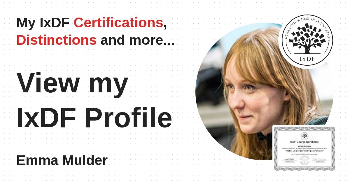 IxDF Course Certificates are awarded to Emma Mulder in formal recognition of their coursework surpassing the rigorous benchmarks of exceptional performance established by the IxDF Educational Codex.