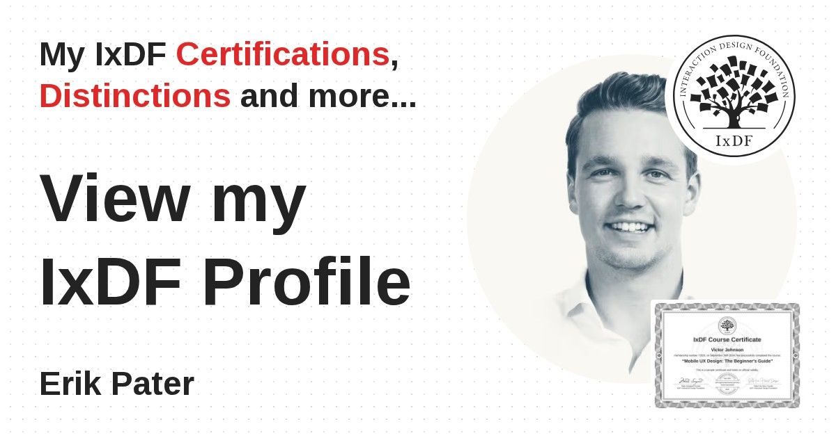 IxDF Course Certificates are awarded to Erik Pater in formal recognition of their coursework surpassing the rigorous benchmarks of exceptional performance established by the IxDF Educational Codex.