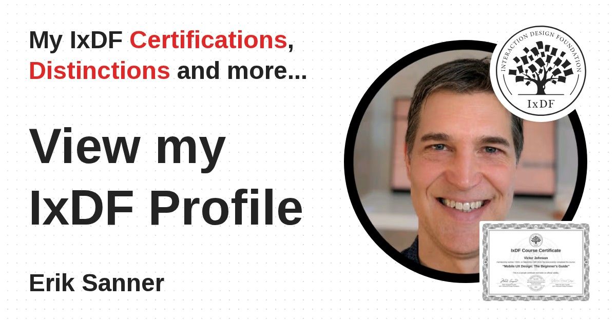 IxDF Course Certificates are awarded to Erik Sanner in formal recognition of their coursework surpassing the rigorous benchmarks of exceptional performance established by the IxDF Educational Codex.