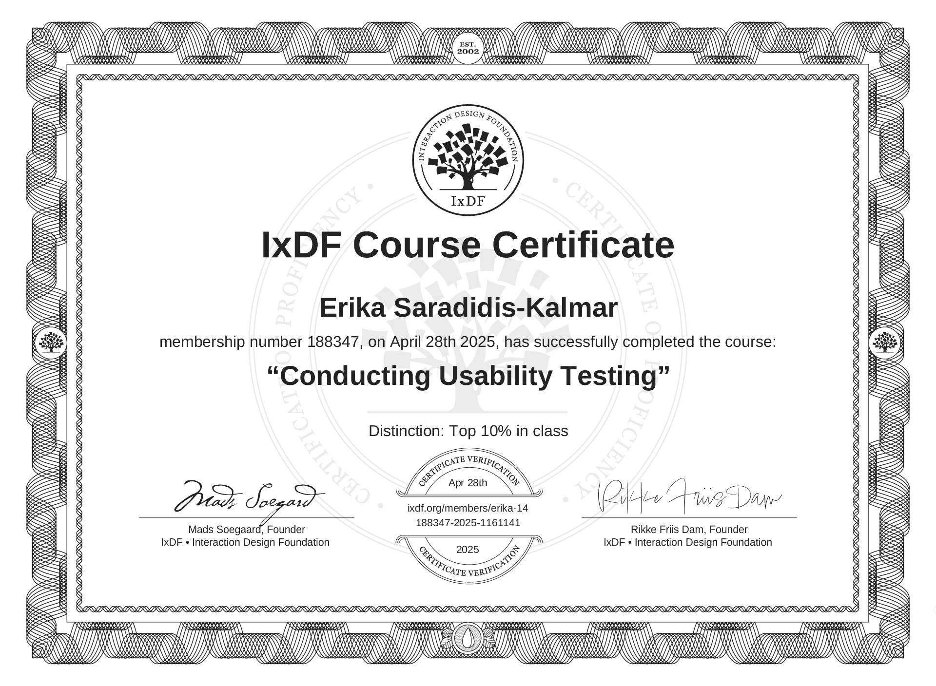 IxDF Course Certificate awarded to Erika Saradidis-Kalmar for completing the "Conducting Usability Testing" course