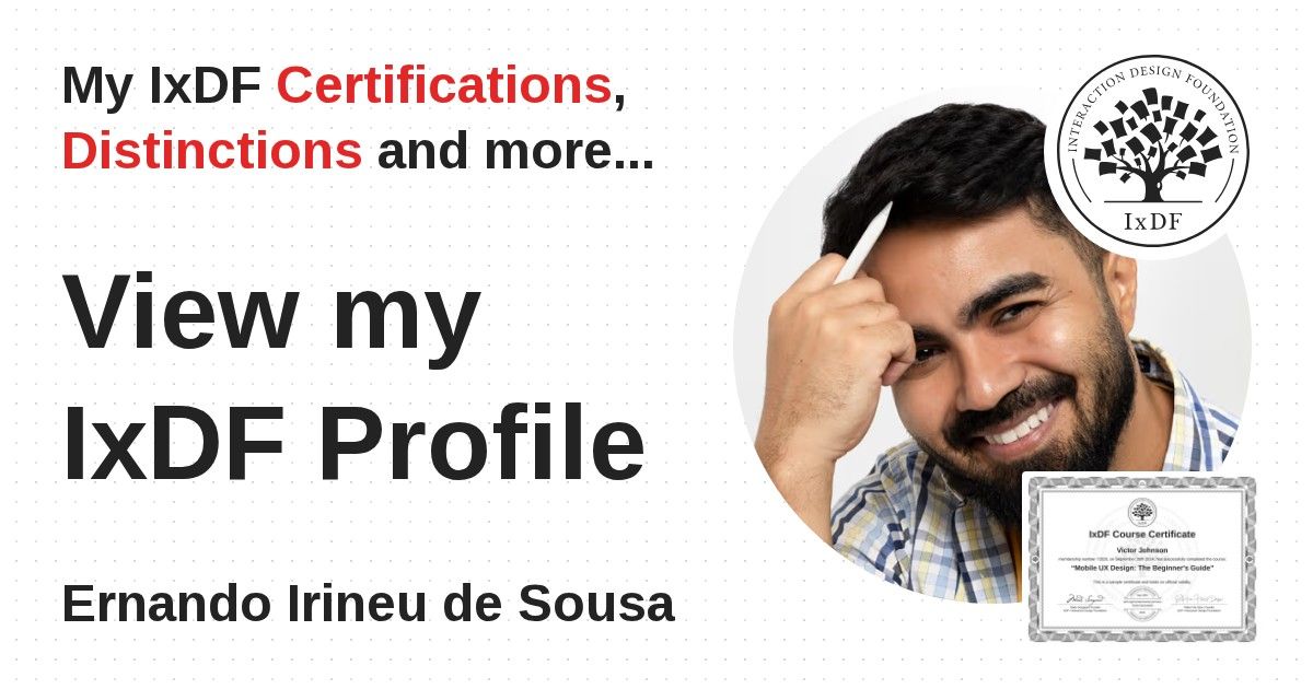 IxDF Course Certificates are awarded to Ernando Irineu de Sousa in formal recognition of their coursework surpassing the rigorous benchmarks of exceptional performance established by the IxDF Educational Codex.