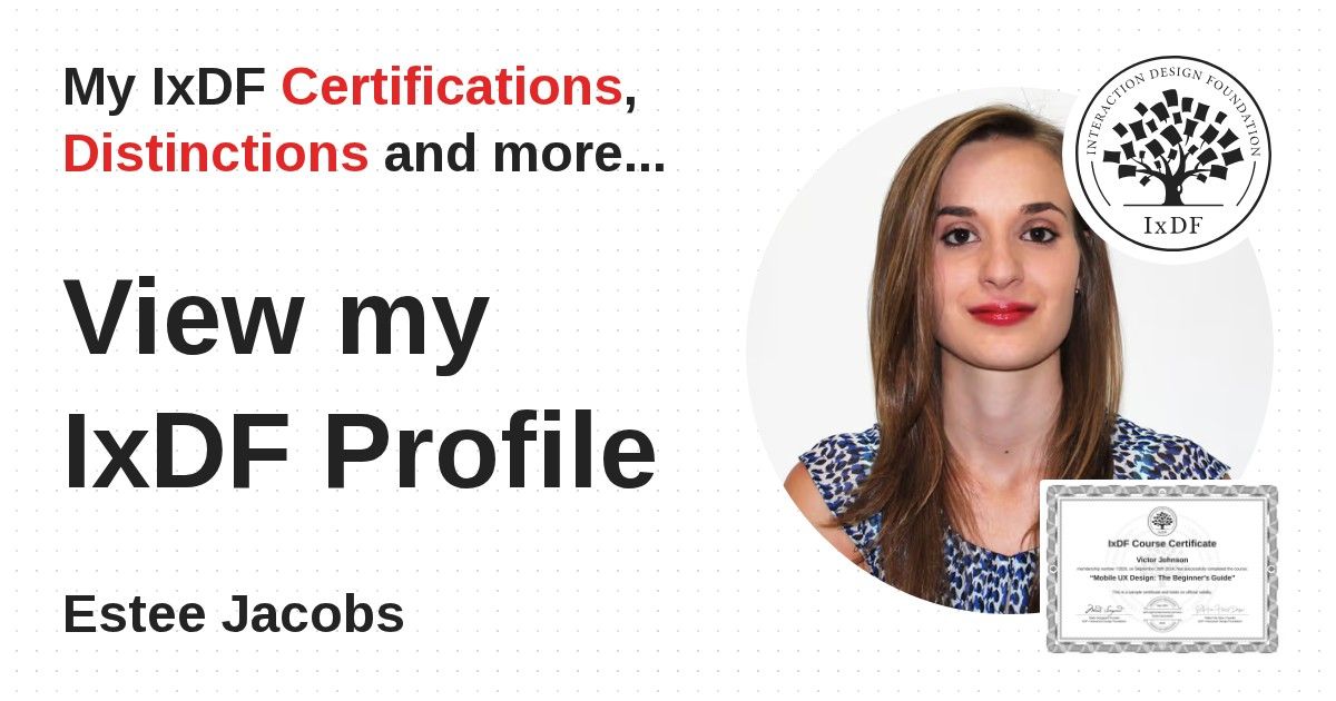 IxDF Course Certificates are awarded to Estee Jacobs in formal recognition of their coursework surpassing the rigorous benchmarks of exceptional performance established by the IxDF Educational Codex.
