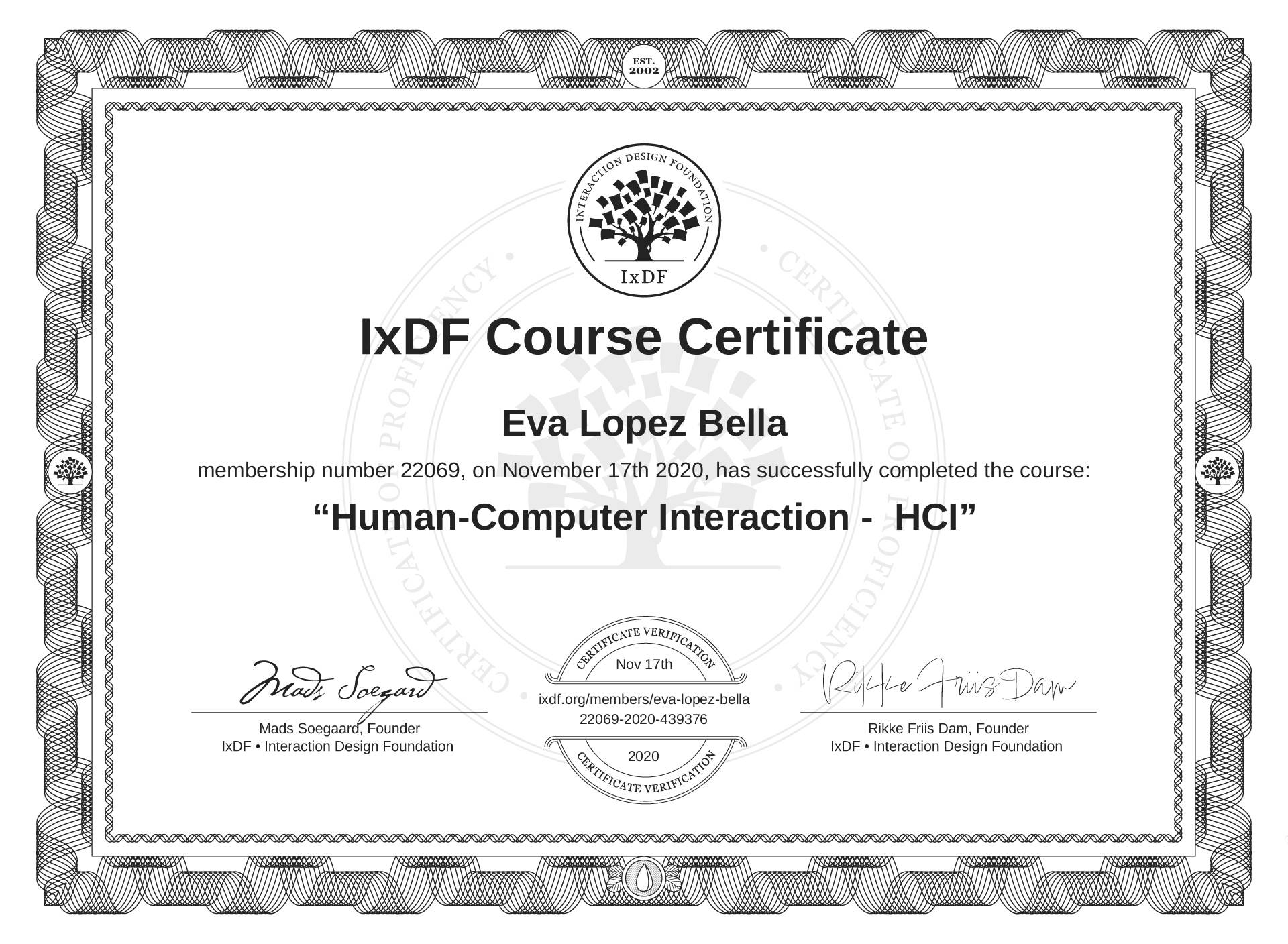 The IxDF Course Certificate (ID #f29160c7-e533-4a6a-af54-ab277ba22202) above is awarded to Eva Lopez Bella in formal recognition of their coursework surpassing the rigorous benchmarks of exceptional performance established by the IxDF Educational Codex. View Course Curriculum.
