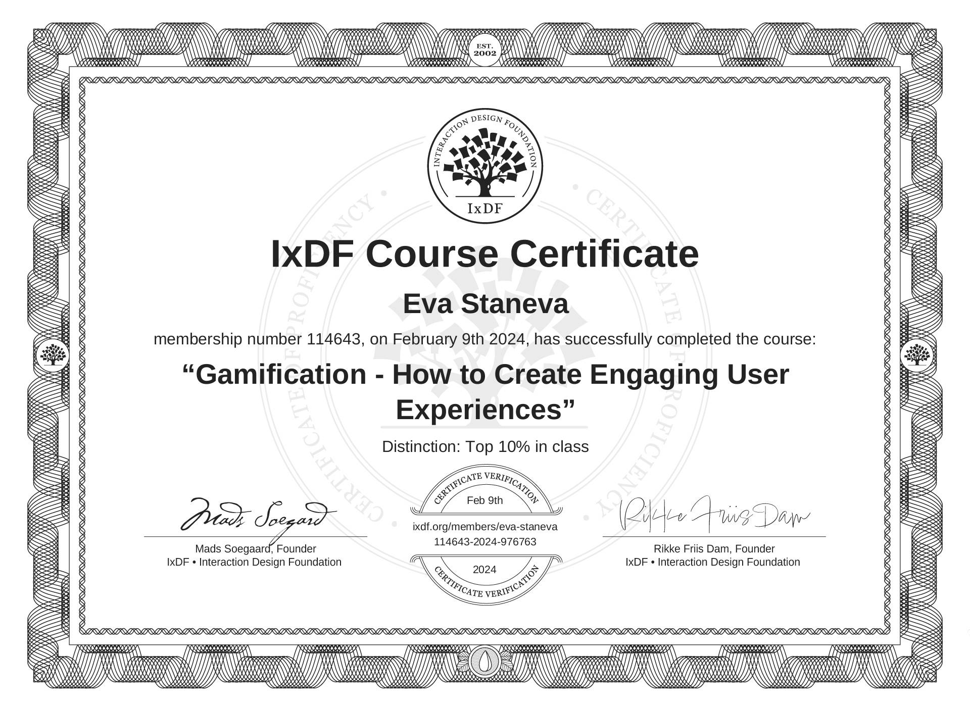 IxDF Course Certificates are awarded to Eva Staneva in formal recognition of their coursework surpassing the rigorous benchmarks of exceptional performance established by the IxDF Educational Codex.