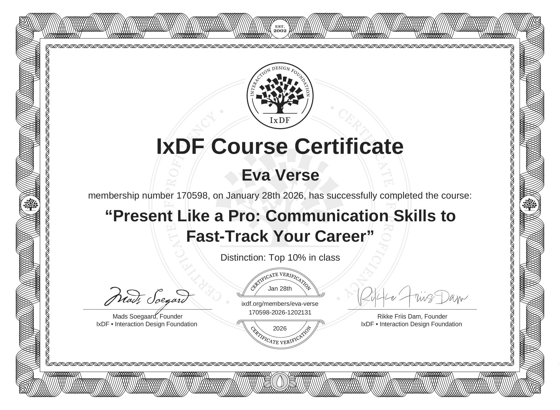 This IxDF Membership Certificate is issued to Eva Verse in formal recognition of their membership of the IxDF, global leader in design education.