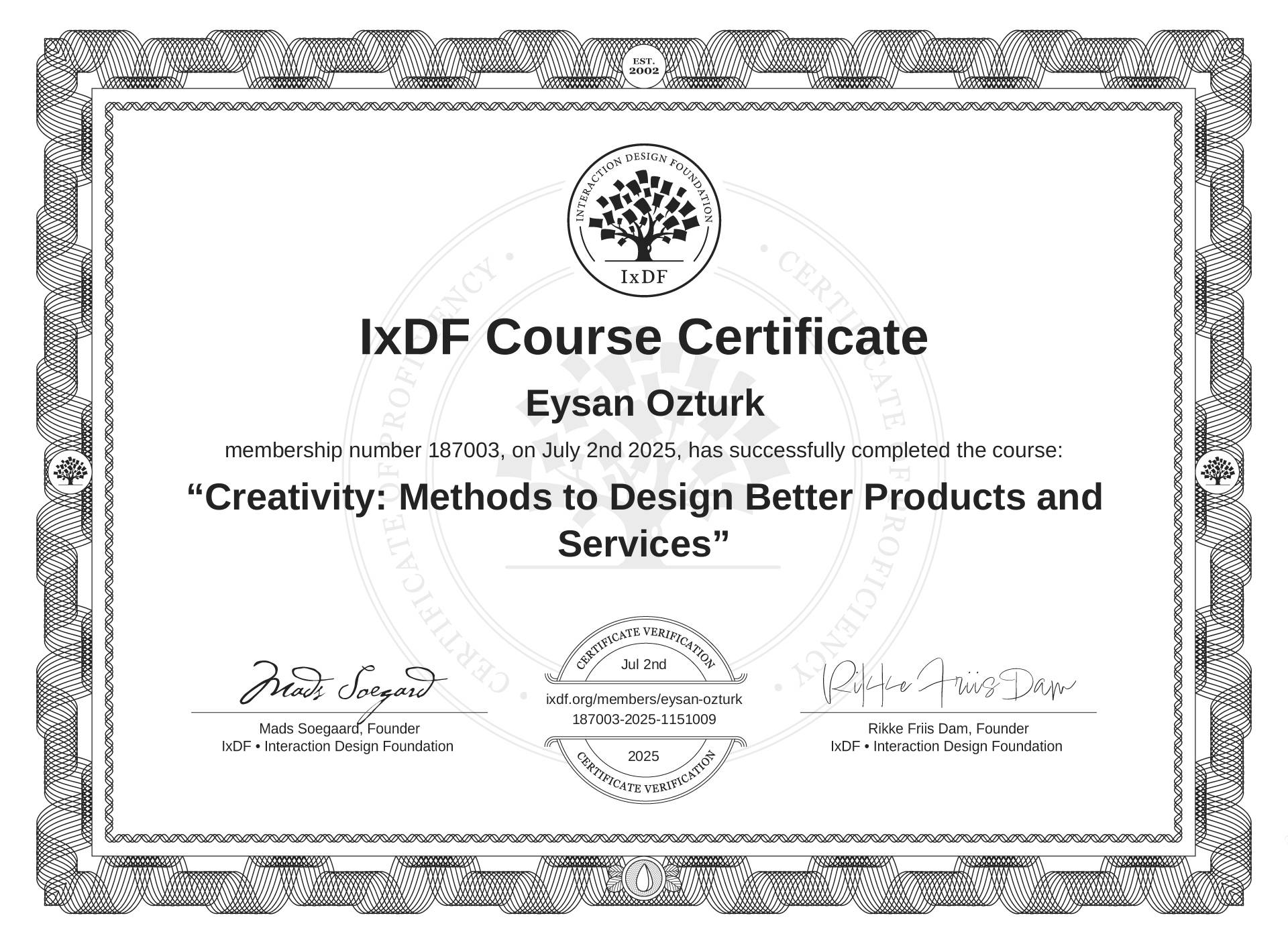 IxDF Course Certificate awarded to Eyşan Öztürk for completing the "Creativity: Methods to Design Better Products and Services" course