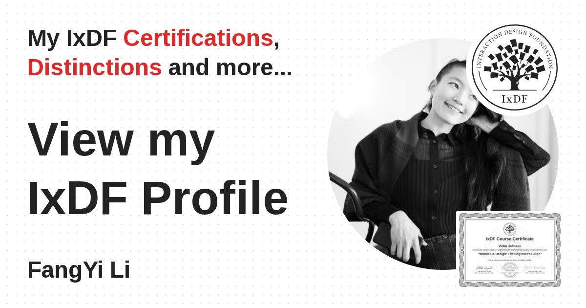 IxDF Course Certificates are awarded to FangYi Li in formal recognition of their coursework surpassing the rigorous benchmarks of exceptional performance established by the IxDF Educational Codex.