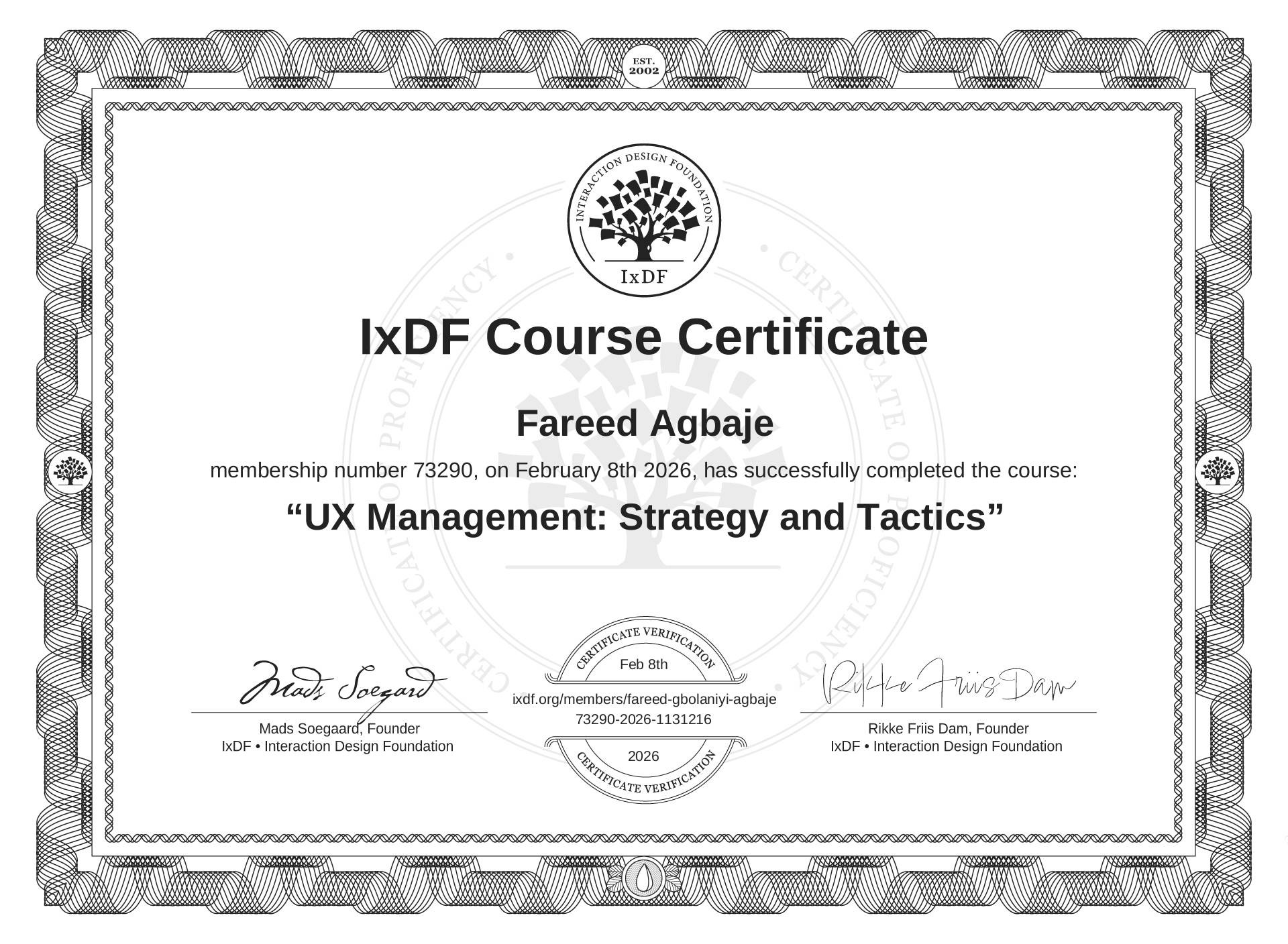 The IxDF Course Certificate (ID #d81fcbf8-4b18-48c5-88f0-8b06e6c58b17) above is awarded to Fareed Agbaje
