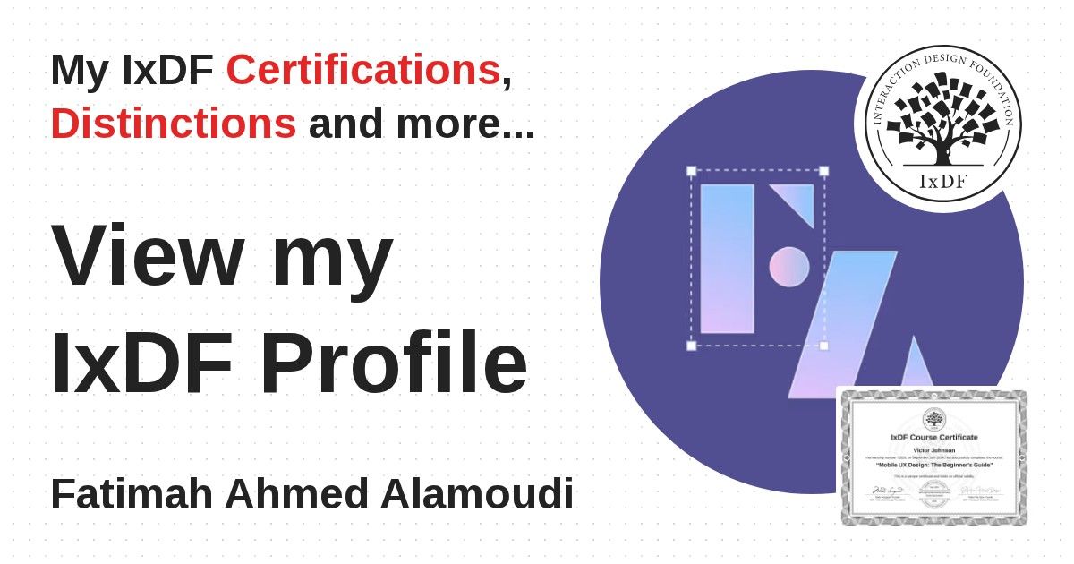 IxDF Course Certificates are awarded to Fatimah Ahmed Alamoudi in formal recognition of their coursework surpassing the rigorous benchmarks of exceptional performance established by the IxDF Educational Codex.