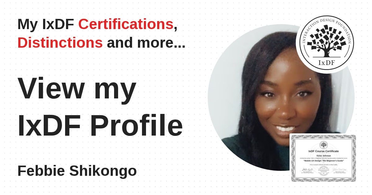 IxDF Course Certificates are awarded to Febbie Shikongo in formal recognition of their coursework surpassing the rigorous benchmarks of exceptional performance established by the IxDF Educational Codex.