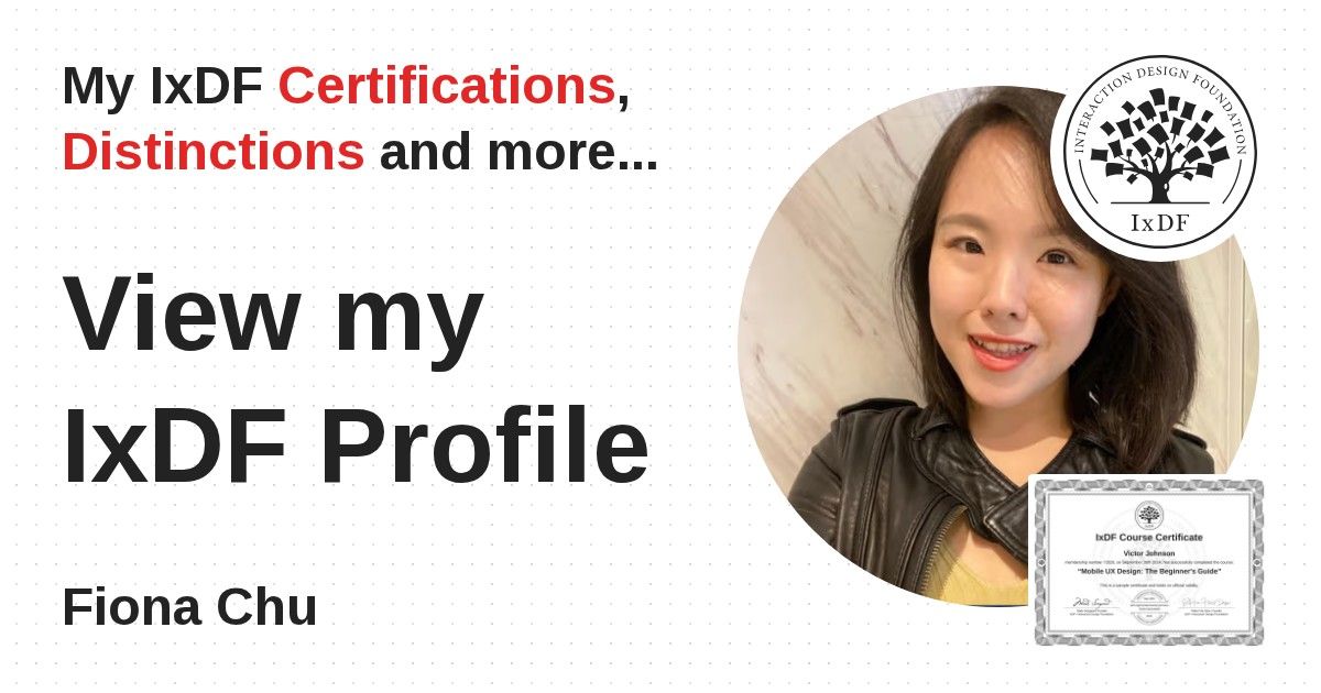 IxDF Course Certificates are awarded to Fiona Chu in formal recognition of their coursework surpassing the rigorous benchmarks of exceptional performance established by the IxDF Educational Codex.