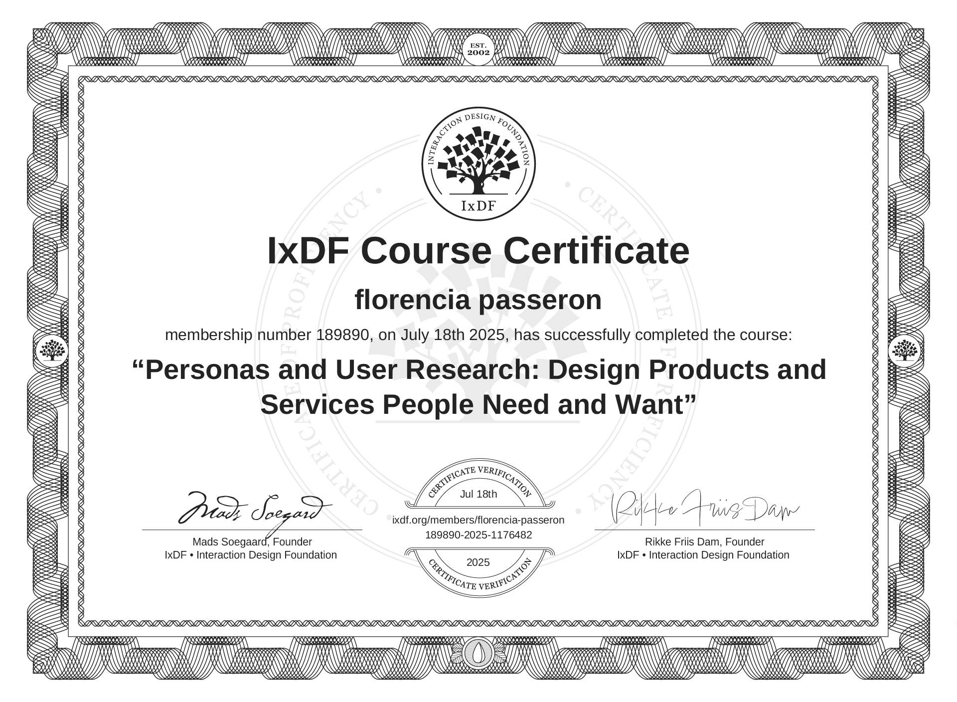 This IxDF Membership Certificate is issued to florencia passeron