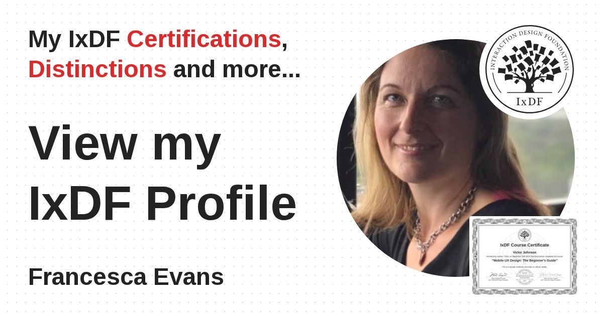 IxDF Course Certificates are awarded to Francesca Evans in formal recognition of their coursework surpassing the rigorous benchmarks of exceptional performance established by the IxDF Educational Codex.