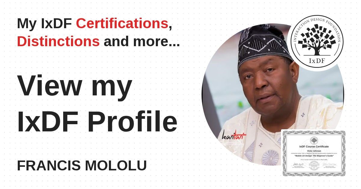 IxDF Course Certificates are awarded to FRANCIS MOLOLU in formal recognition of their coursework surpassing the rigorous benchmarks of exceptional performance established by the IxDF Educational Codex.