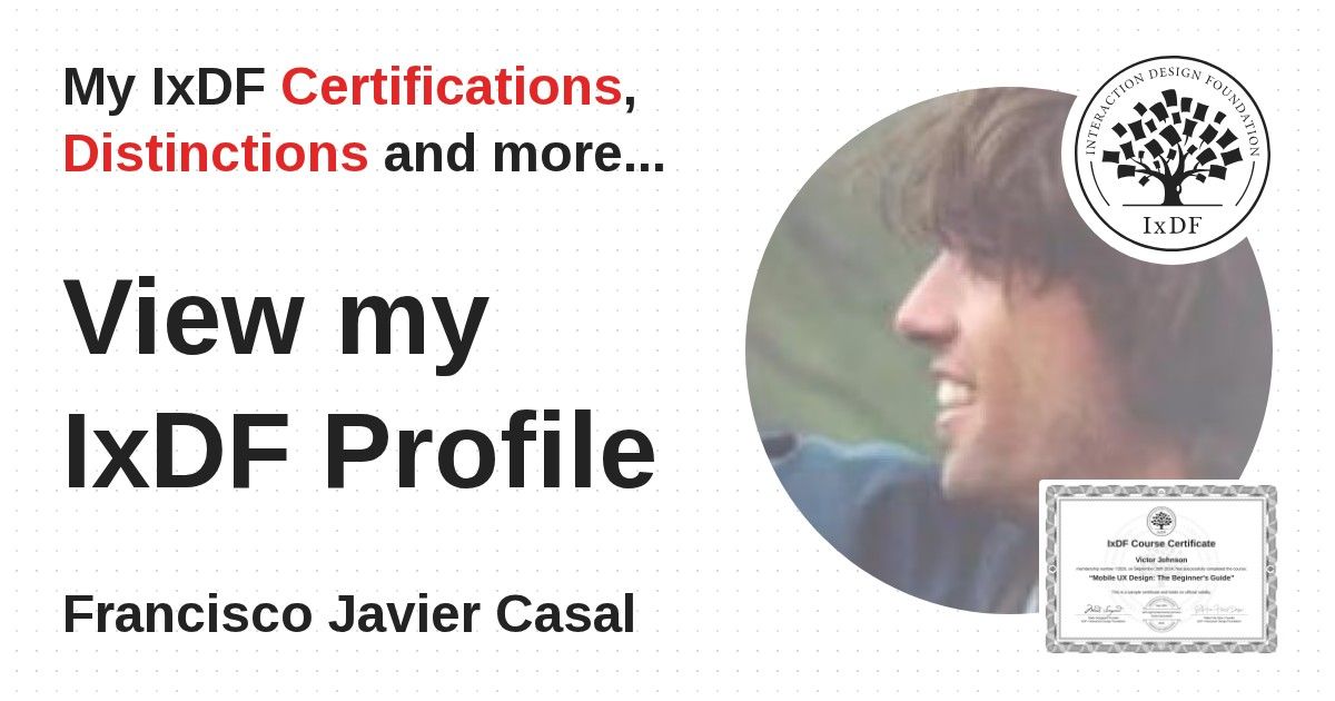 IxDF Course Certificates are awarded to Francisco Javier Casal in formal recognition of their coursework surpassing the rigorous benchmarks of exceptional performance established by the IxDF Educational Codex.