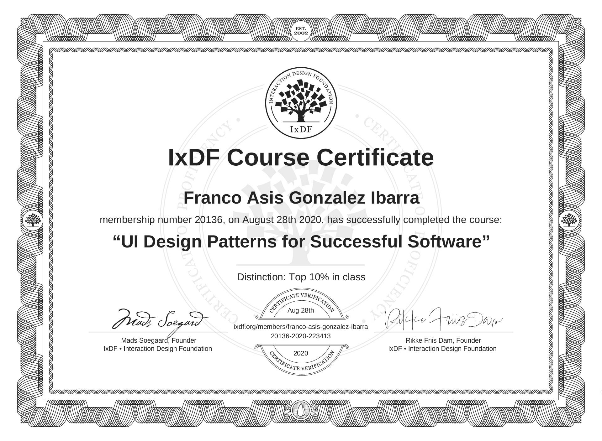 IxDF Course Certificate awarded to Franco Asis González Ibarra for completing the "UI Design Patterns for Successful Software" course