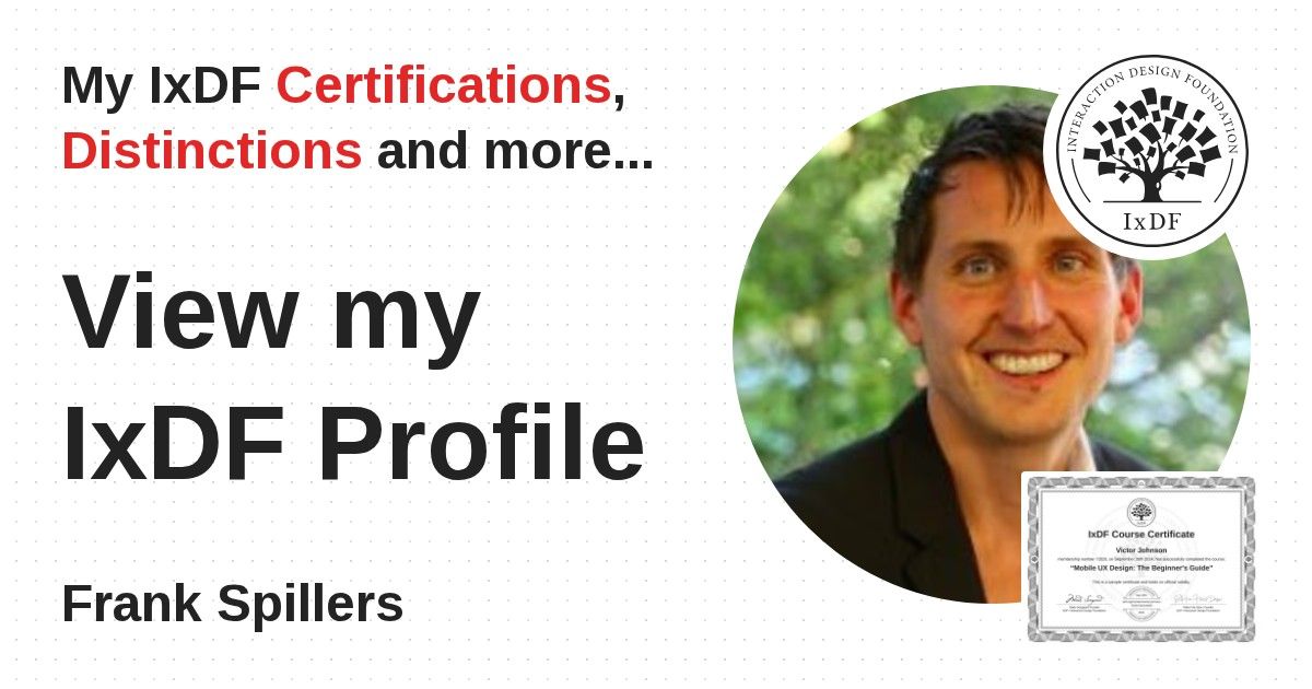 This IxDF Membership Certificate is issued to Frank Spillers in formal recognition of their membership of the IxDF, global leader in design education.