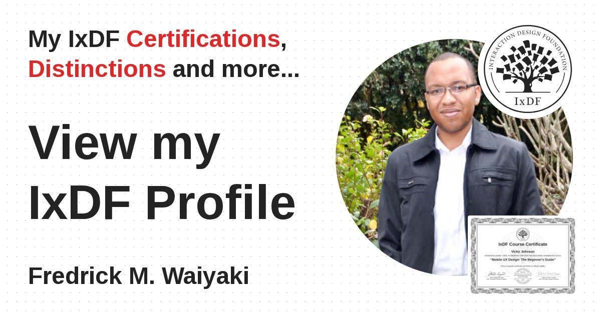 IxDF Course Certificates are awarded to Fredrick M. Waiyaki in formal recognition of their coursework surpassing the rigorous benchmarks of exceptional performance established by the IxDF Educational Codex.