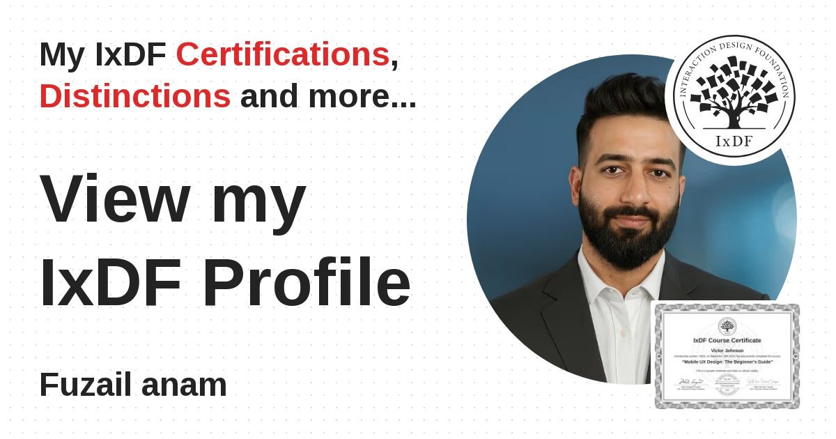 IxDF Course Certificates are awarded to Fuzail anam in formal recognition of their coursework surpassing the rigorous benchmarks of exceptional performance established by the IxDF Educational Codex.