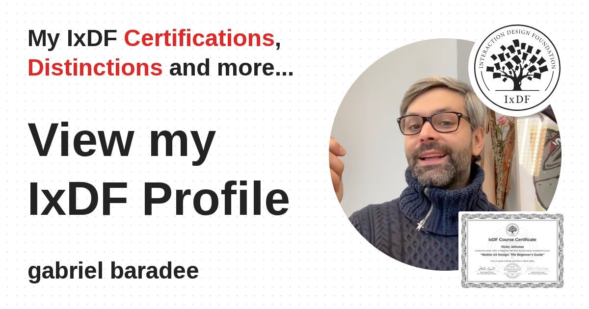 IxDF Course Certificates are awarded to gabriel baradee in formal recognition of their coursework surpassing the rigorous benchmarks of exceptional performance established by the IxDF Educational Codex.