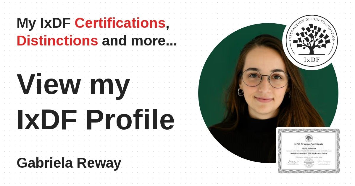 IxDF Course Certificates are awarded to Gabriela Reway in formal recognition of their coursework surpassing the rigorous benchmarks of exceptional performance established by the IxDF Educational Codex.