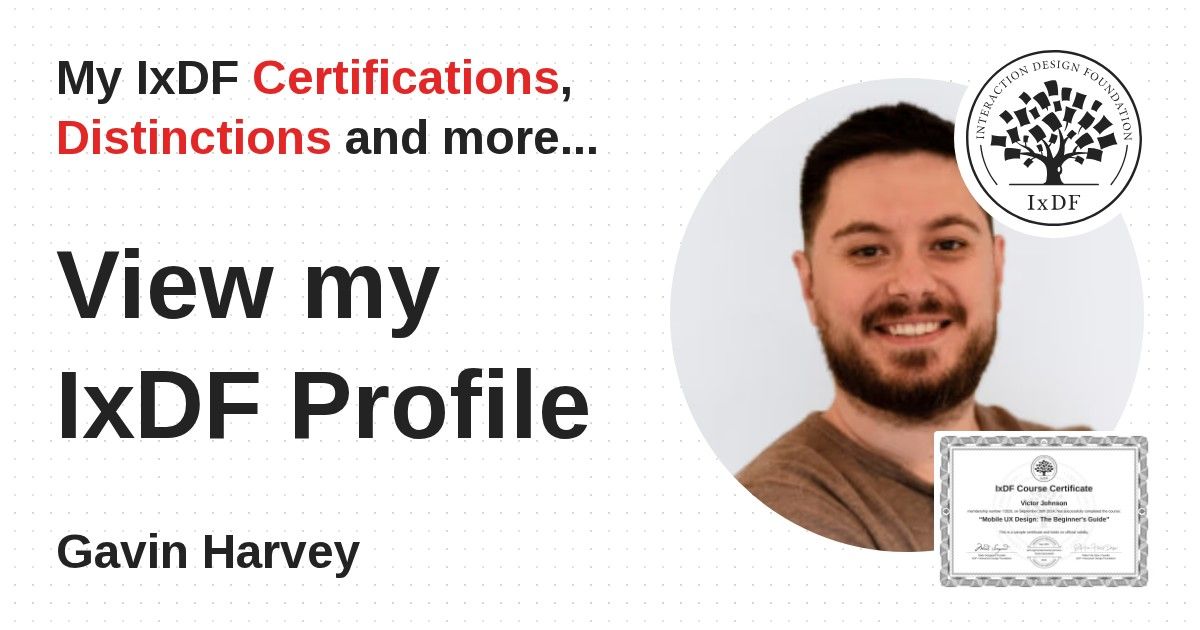 IxDF Course Certificates are awarded to Gavin Harvey in formal recognition of their coursework surpassing the rigorous benchmarks of exceptional performance established by the IxDF Educational Codex.