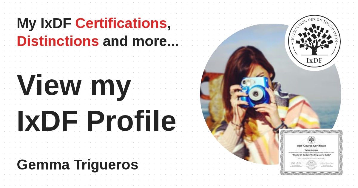 IxDF Course Certificates are awarded to Gemma Trigueros in formal recognition of their coursework surpassing the rigorous benchmarks of exceptional performance established by the IxDF Educational Codex.