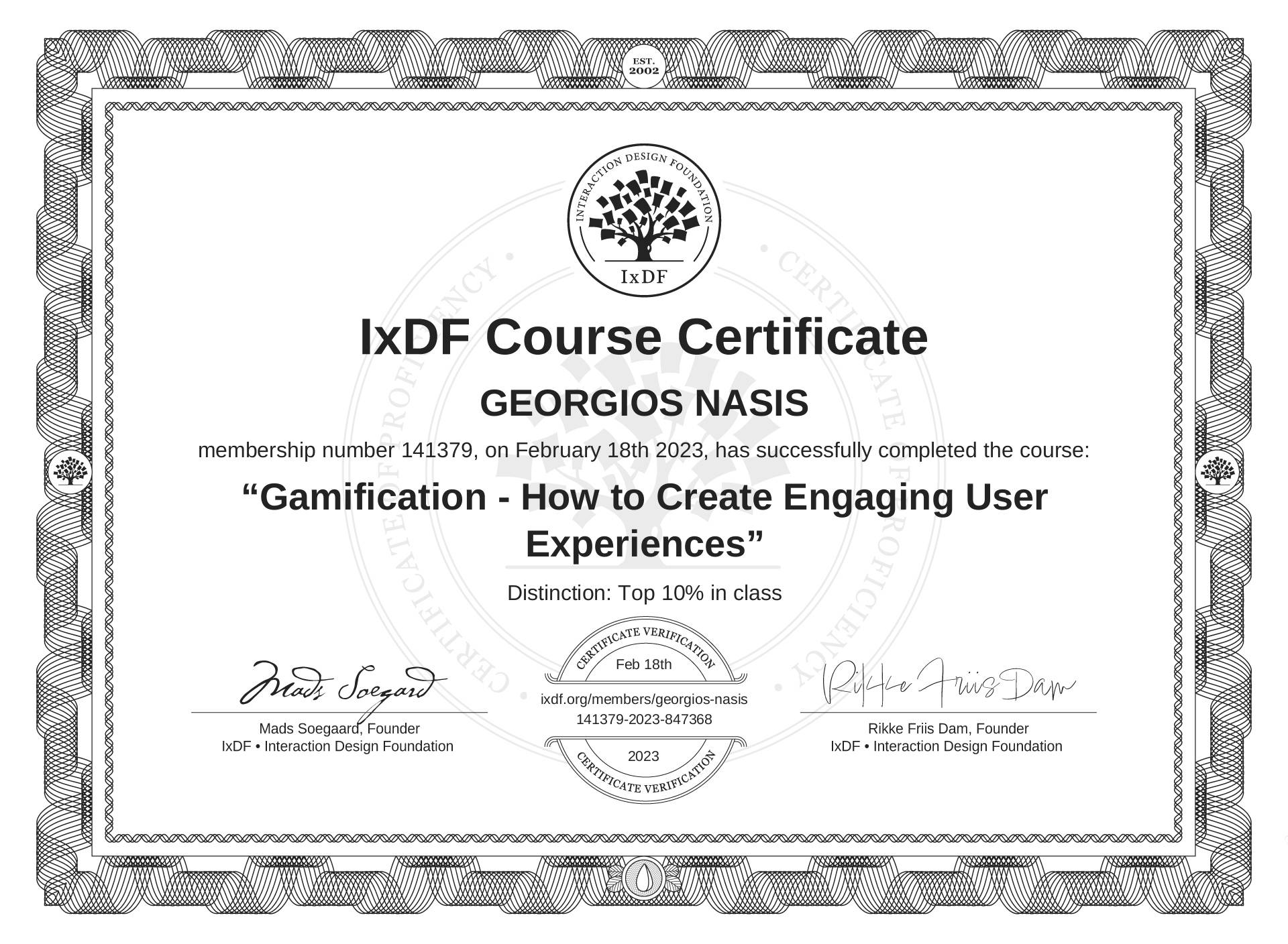 The IxDF Course Certificate (ID #510c16c0-d6f6-4d70-baaa-7c03afcfe692) above is awarded to GEORGIOS NASIS with a Top 10% Distinction in formal recognition of their coursework surpassing the rigorous benchmarks of exceptional performance established by the IxDF Educational Codex. View Course Curriculum.
