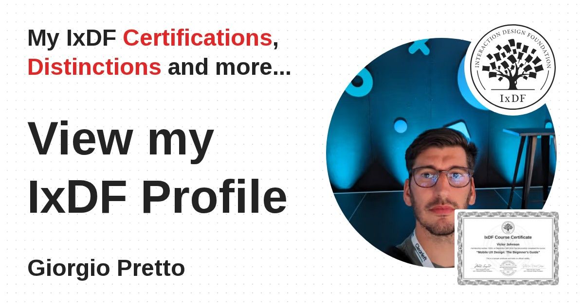 IxDF Course Certificates are awarded to Giorgio Pretto in formal recognition of their coursework surpassing the rigorous benchmarks of exceptional performance established by the IxDF Educational Codex.