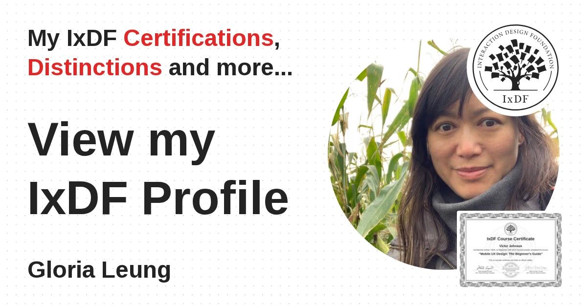 IxDF Course Certificates are awarded to Gloria Leung in formal recognition of their coursework surpassing the rigorous benchmarks of exceptional performance established by the IxDF Educational Codex.