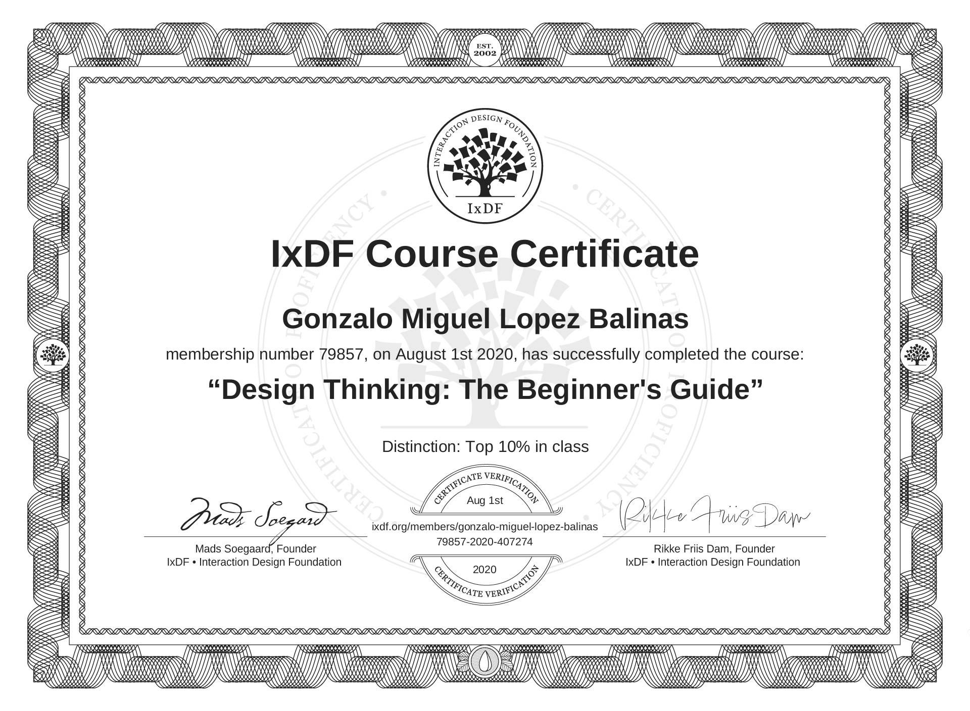 IxDF Course Certificate awarded to Gonzalo Miguel Lopez Baliñas for completing the "Design Thinking: The Beginner's Guide" course