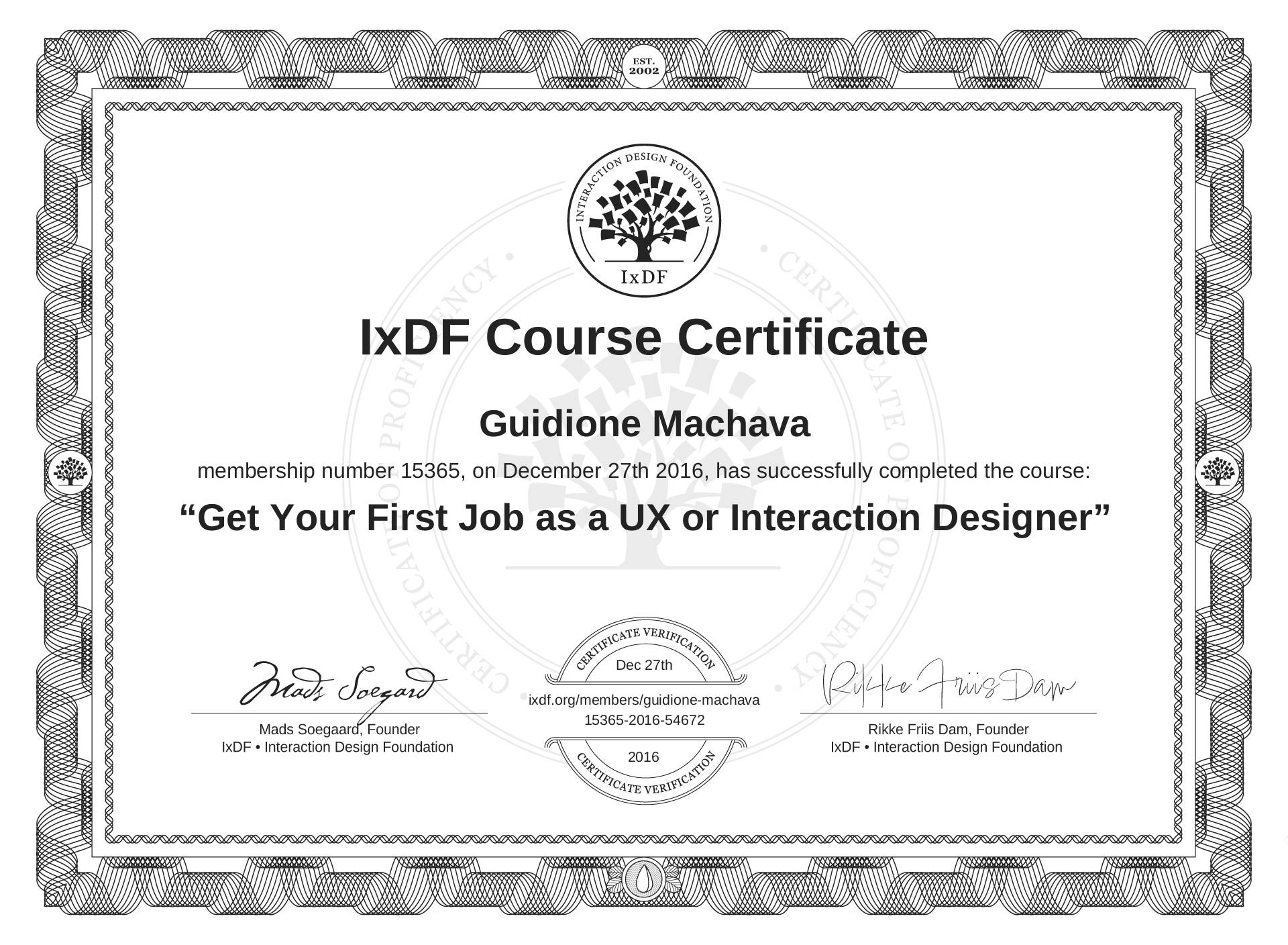 IxDF Course Certificates are awarded to Guidione Machava in formal recognition of their coursework surpassing the rigorous benchmarks of exceptional performance established by the IxDF Educational Codex.