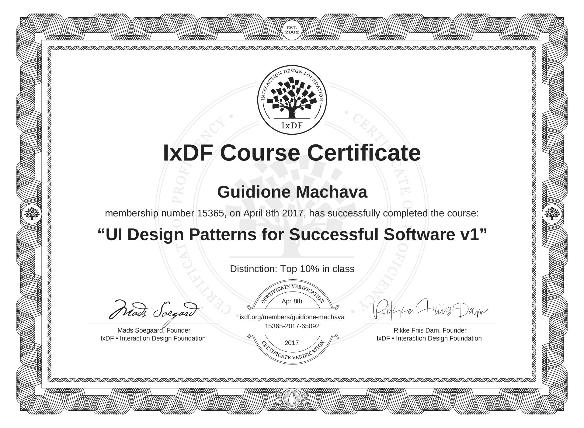 IxDF Course Certificates are awarded to Guidione Machava in formal recognition of their coursework surpassing the rigorous benchmarks of exceptional performance established by the IxDF Educational Codex.
