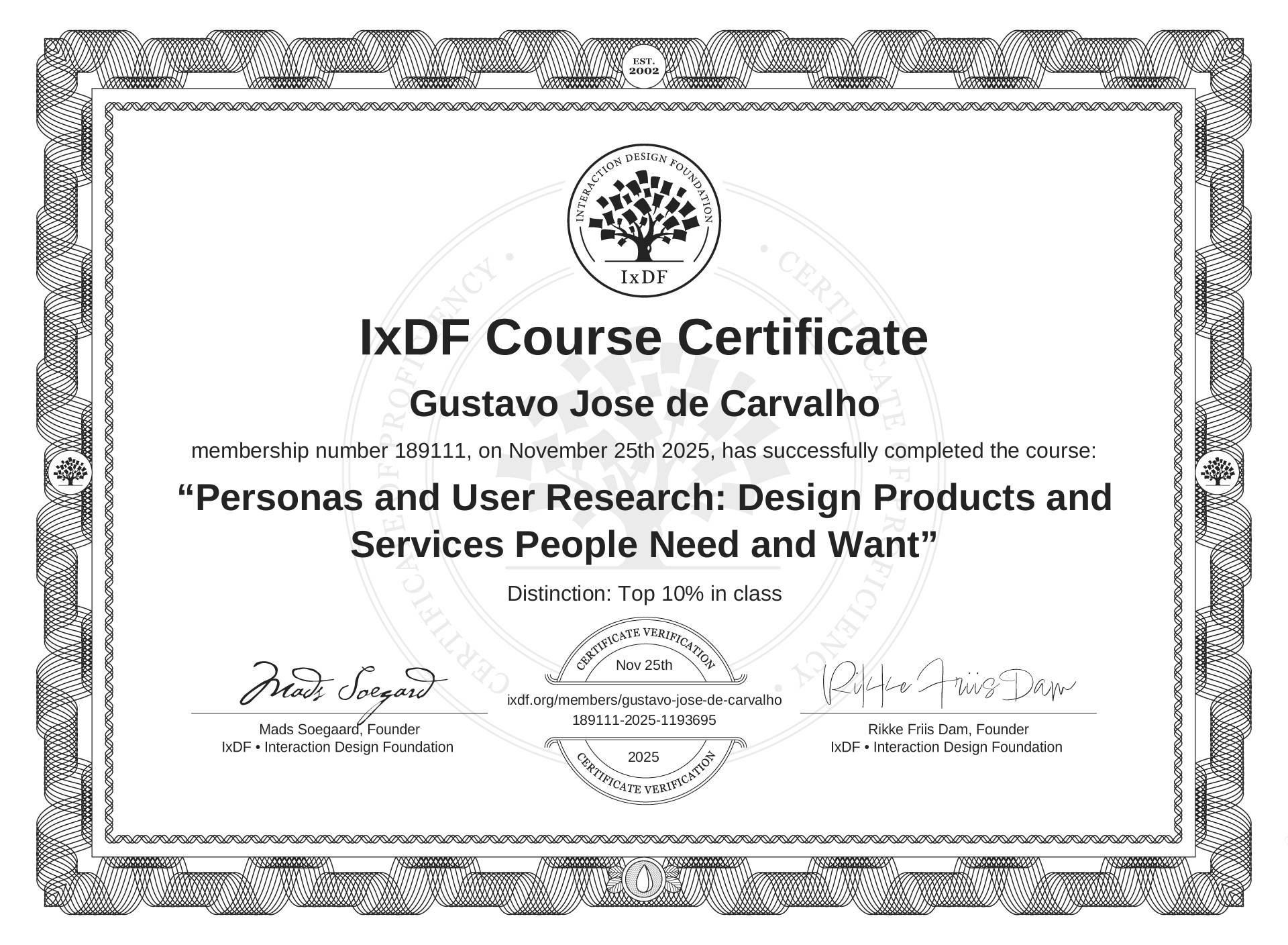 The IxDF Course Certificate (ID #52f84525-83eb-4fe7-8048-2bcca70f2dc1) above is awarded to Gustavo José de Carvalho with a Top 10% Distinction in formal recognition of their coursework surpassing the rigorous benchmarks of exceptional performance established by the IxDF Educational Codex. View Course Curriculum.