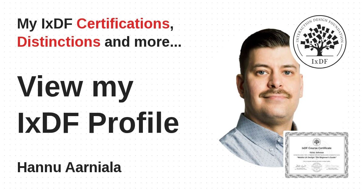 IxDF Course Certificates are awarded to Hannu Aarniala in formal recognition of their coursework surpassing the rigorous benchmarks of exceptional performance established by the IxDF Educational Codex.