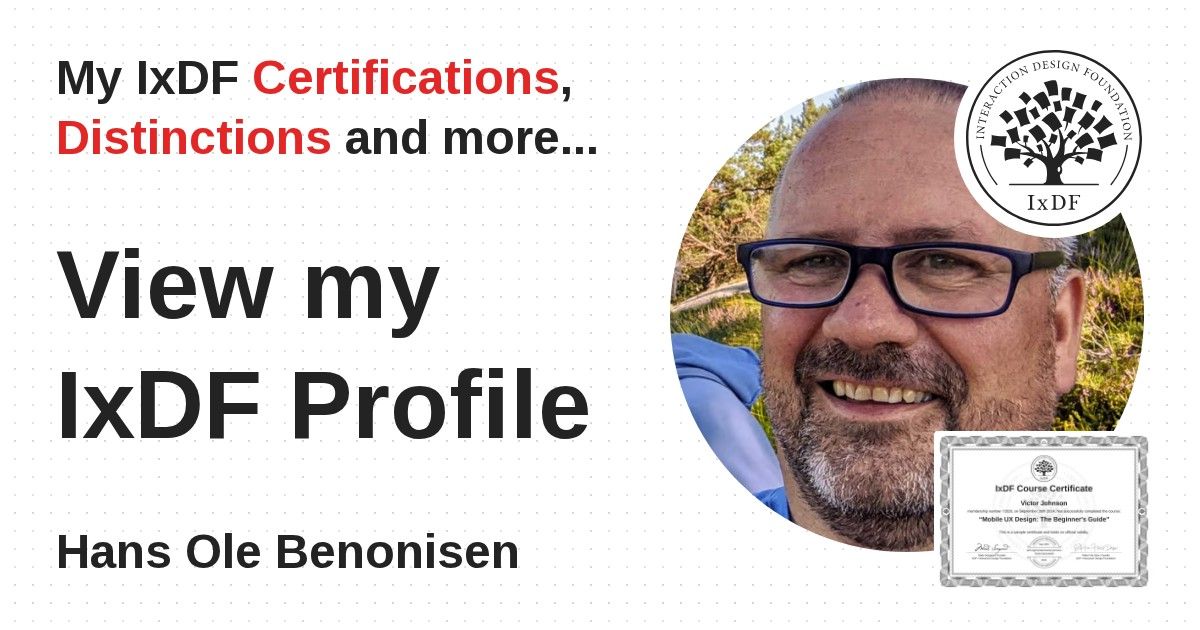 IxDF Course Certificates are awarded to Hans Ole Benonisen in formal recognition of their coursework surpassing the rigorous benchmarks of exceptional performance established by the IxDF Educational Codex.
