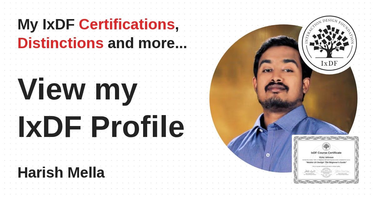 Distinctions are conferred upon Harish Mella in formal recognition of their notable achievements and contributions, as stipulated by the IxDF Educational Codex.
