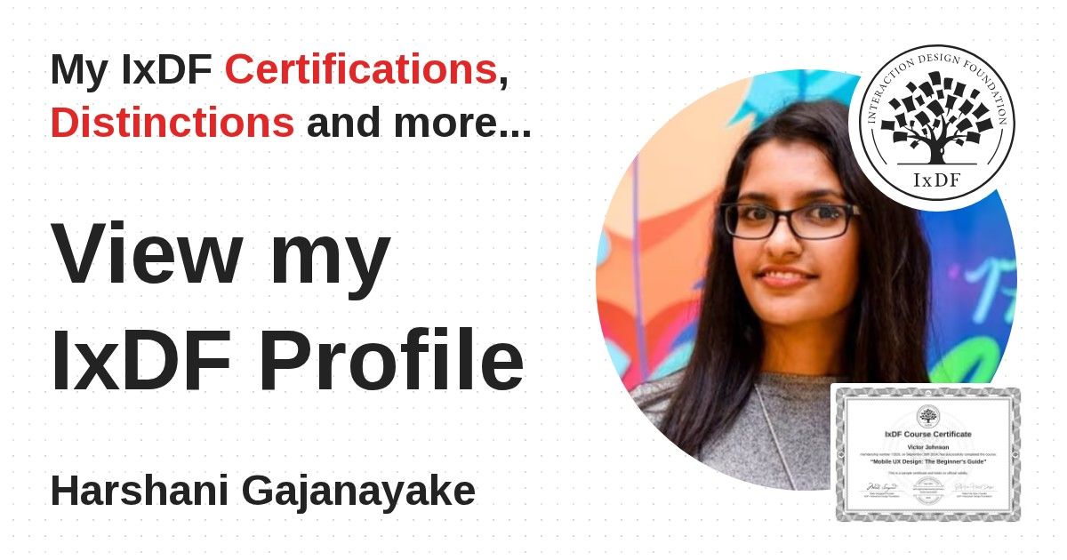 IxDF Course Certificates are awarded to Harshani Gajanayake in formal recognition of their coursework surpassing the rigorous benchmarks of exceptional performance established by the IxDF Educational Codex.