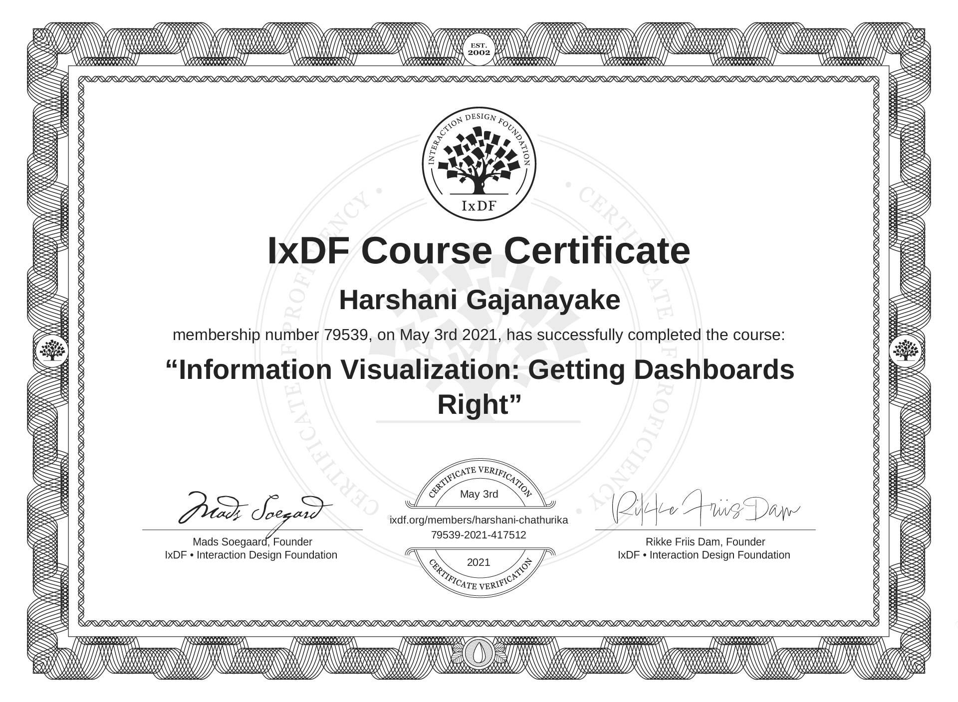 IxDF Course Certificate awarded to Harshani Gajanayake for completing the "Information Visualization: Getting Dashboards Right" course