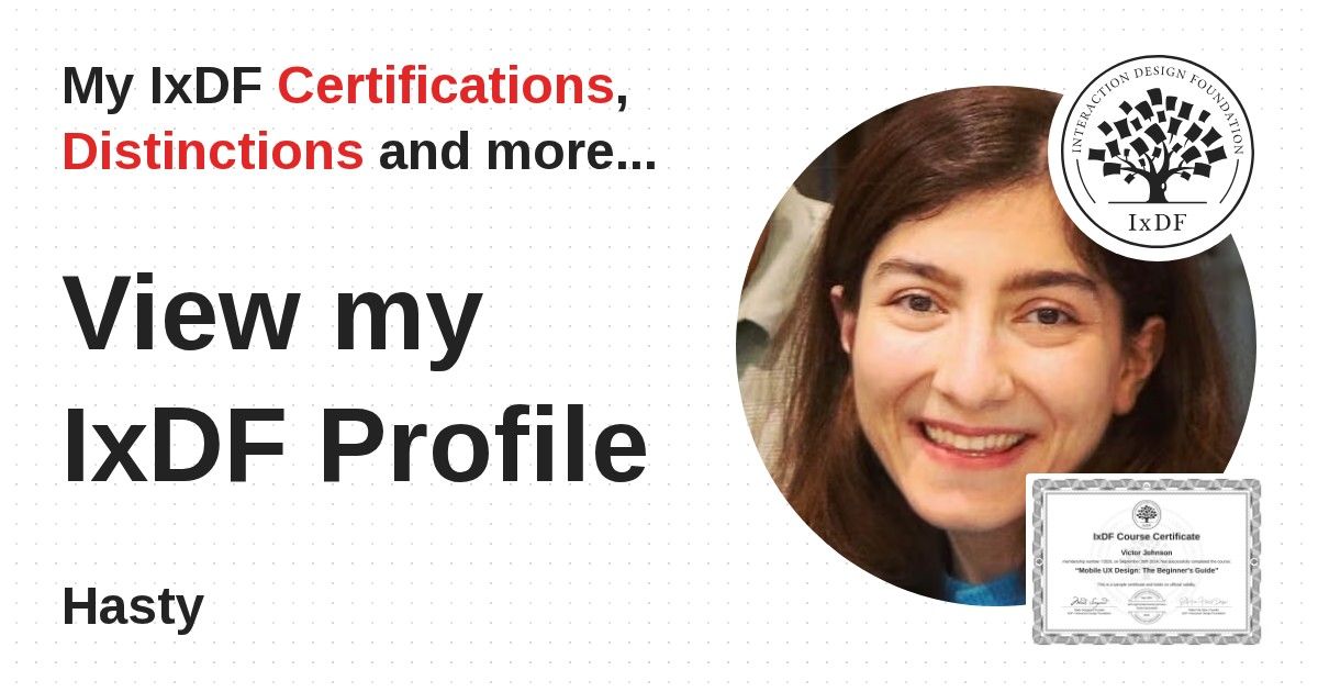 IxDF Course Certificates are awarded to Hasty in formal recognition of their coursework surpassing the rigorous benchmarks of exceptional performance established by the IxDF Educational Codex.