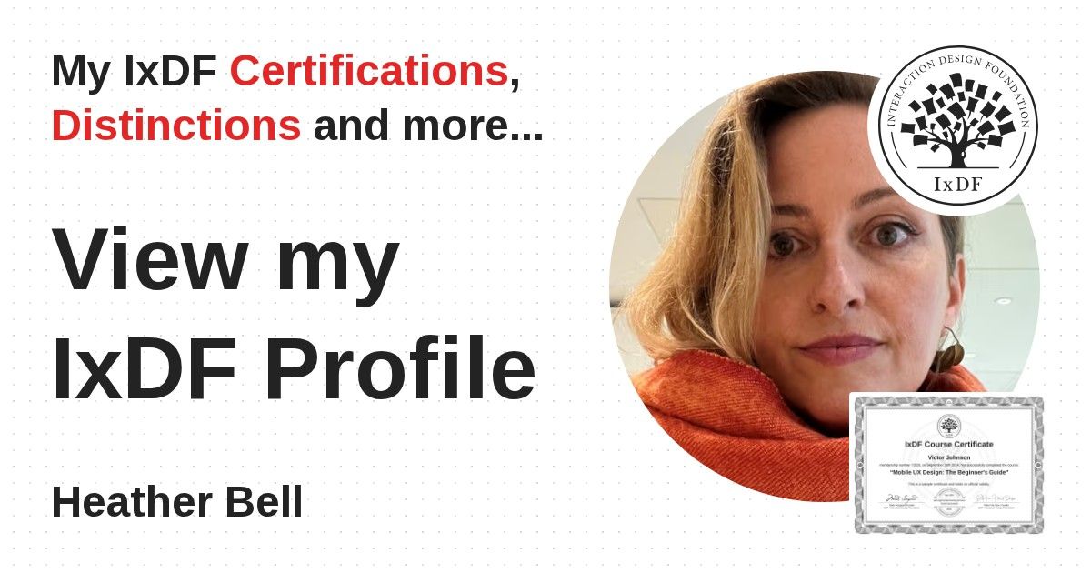 IxDF Course Certificates are awarded to Heather Bell in formal recognition of their coursework surpassing the rigorous benchmarks of exceptional performance established by the IxDF Educational Codex.