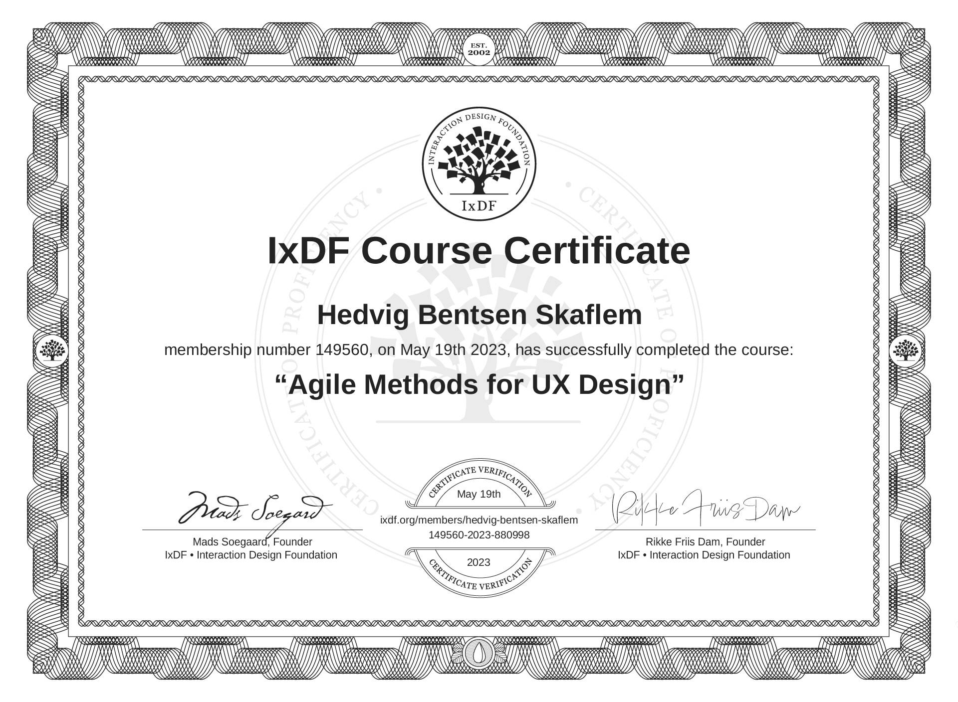 IxDF Course Certificate awarded to Hedvig Bentsen Skaflem for completing the "Agile Methods for UX Design" course