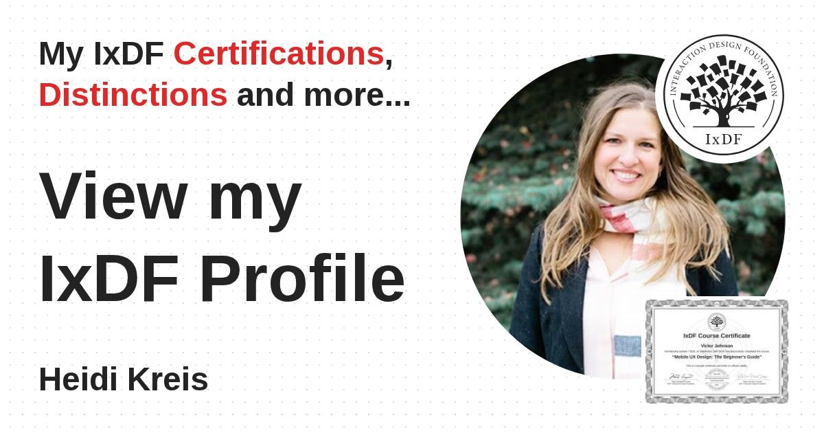 IxDF Course Certificates are awarded to Heidi Kreis in formal recognition of their coursework surpassing the rigorous benchmarks of exceptional performance established by the IxDF Educational Codex.