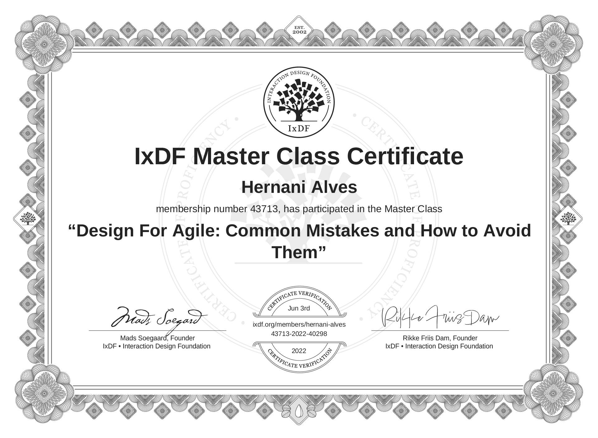 The IxDF Master Class Certificate (ID #mcc_1e427d67535e4bc8a8b101870e241370) above is awarded to Hernani Alves in formal recognition of their participation in the Master Class Design For Agile: Common Mistakes and How to Avoid Them .
