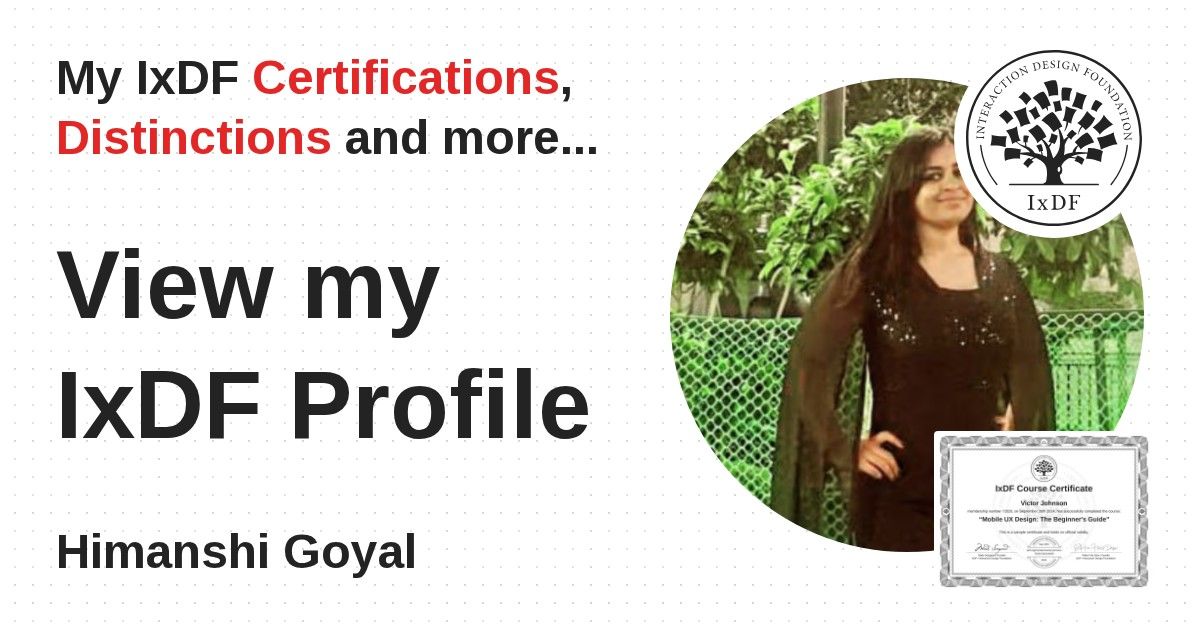 IxDF Course Certificates are awarded to Himanshi Goyal in formal recognition of their coursework surpassing the rigorous benchmarks of exceptional performance established by the IxDF Educational Codex.